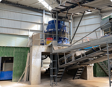 破碎階段:原料進入破碎機內通過顎式破碎機和圓錐破碎機的兩道破碎,然后由設備排料口排出落到設備下方的上料皮帶上;